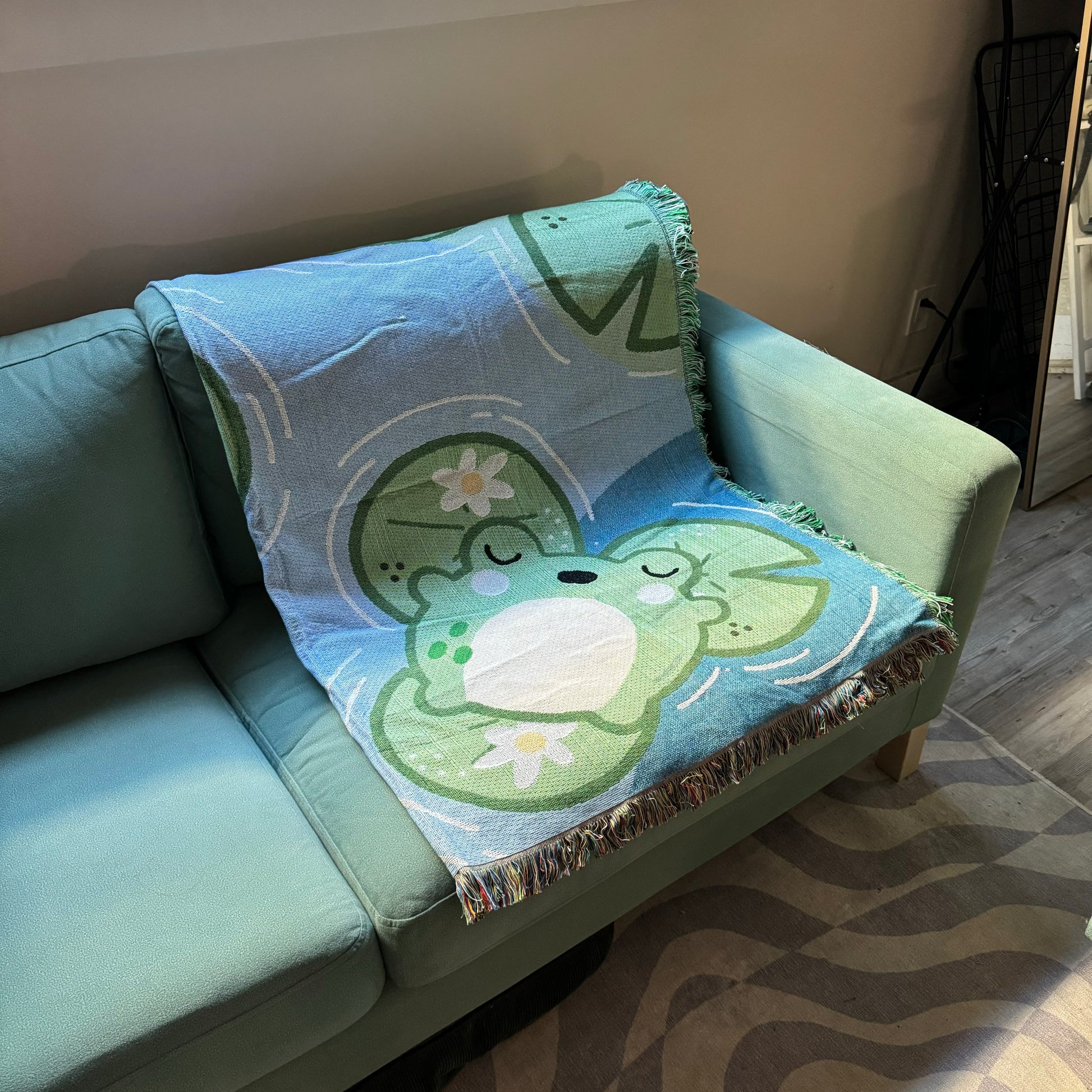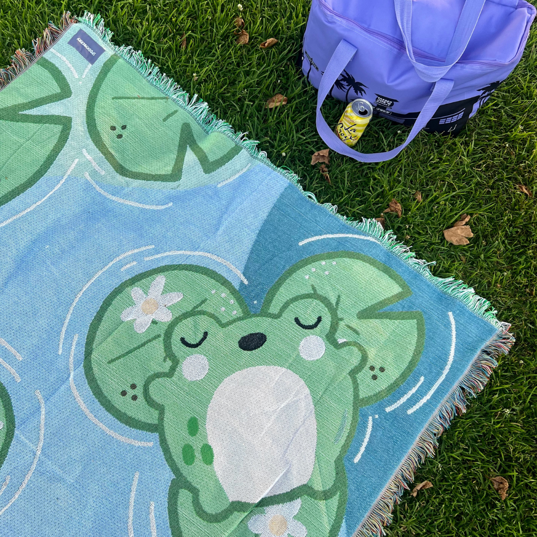 Cozy throw blanket with little sleepy frogs, perfect for decorating your space or taking on a picnic. Material softens up with use.