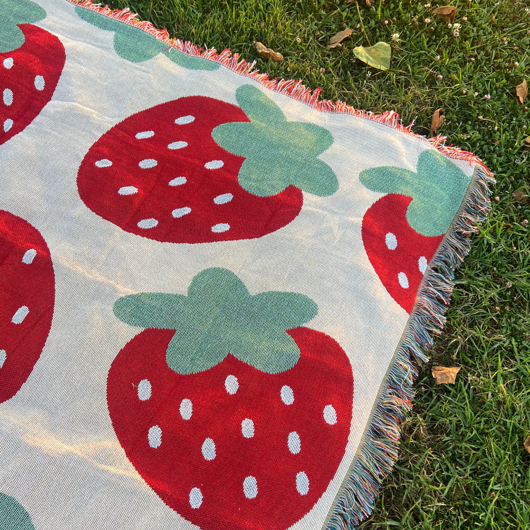 Cozy throw blanket with little strawberries, perfect for decorating your space or taking on a picnic. Material softens up with use.